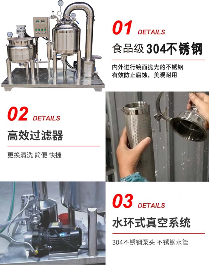3 、預(yù)熱罐、濃縮罐的夾層內(nèi)加滿水,以防加熱器干燒;夾層出氣口嚴禁封閉;接好冷凝器的冷卻水管,冷卻水底進高出。